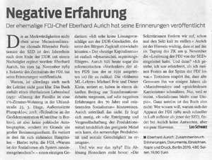 RBB: Zum Beitrag "70 Jahre Freie Deutsche Jugend"-Interview mit Eberhard Aurich Eberhard Aurich trat 1983 als Nachfolger von Egon Krenz, an die Spitze der Freien Deutschen Jugend (FDJ). Als erster Sekretär leitete er die Jugendorganisation der DDR bis November 1989. Seine Rolle als FDJ-Vorsitzender sieht der gebürtige Chemnitzer heute kritisch: "Es war ein ganz großer Fehler, uns auf Gedeih und Verderb an die Partei zu ketten." Sehen Sie hier ein Interview mit Eberhard Aurich, das Christoph Hölscher geführt hat.