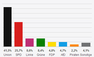 Angela Merkel (CDU) wird vom Deutschen Bundestag zur Bundeskanzlerin Deutschlands gewählt. Vizekanzler wird Sigmar Gabriel (SPD). Damit wird zum dritten Mal in der Geschichte der BRD eine Große Koalition etabliert. |