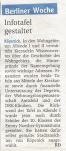 Bürgerversammlung im Allende-Viertel zur Verteilung von 2 100 EUR aus der Kiez-Kasse. Beschlossen werden: 800 EUR für Kieztafel Allende-Viertel II, 150 EUR für Ergänzung Kieztafel Allende-Viertel I (Zeichenwettbewerb Emmy-Noether-Gymnasium), 550 EUR für ein interkulturelles Kinderfest im Allende-Viertel im Allende-Viertel mit Migrantenkindern sowie 600 EUR für die Überdachung der Terrasse des Wald-KITA-Wagens in der Bude. Einmütig wurde zudem beschlossen, eine Arbeitsgruppe zu bilden, die engagierte Bürgervorschläge zum Gartendenkmal Volkspark bündelt, prüft und zur Entscheidung bringt. Zur Leitung der Gruppe erklärte sich der Vorsitzende des Bezirksdenkmalrates Stefan Förster bereit. |