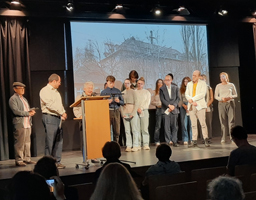 Gedenkveranstaltung für die 94 Bewohner des Jüdischen Altersheims in der Mahlsdorfer Straße, die von den Nazis in Auschwitz, Treblinka, Theresienstadt und anderen Orten umgebracht wurden. Schüler der Merian-Oberschule lasen gemeinsam mit dem Bürgermeister und dem BVV-Vorsitzenden die Namen der Ermordeten, von denen auch zwei Enkel anwesend waren, vor. Dr. Bettina Goldberg erzählte in ihrem Vortrag vom Schicksal der Toten.